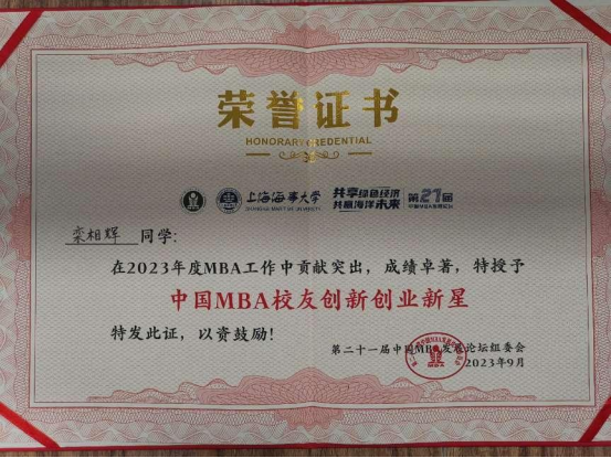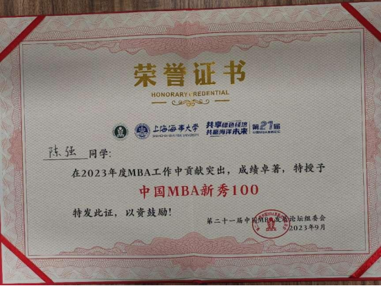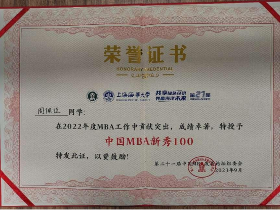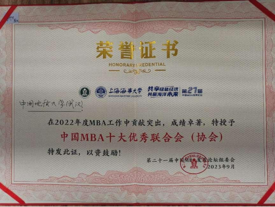 我院专硕联合会喜获“2022年度中国MBA十大优秀联合会”荣誉称号,MBA2018级学生栾相辉获评“中国MBA校友创新创业新星”称号;MBA2021级、地大MBA帆船协会会长周佩佳获评“2022年度中国MBA新秀100”称号;MBA2023级班长陈强获评“2023年度中国MBA新秀100”称号。