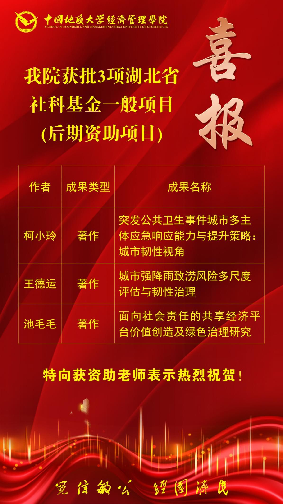 (通讯员 胡松琴)11月14日,2023年度湖北省社科基金一般项目(后期资助项目)拟立项名单公布,williamhill英国中文柯小玲、王德运、池毛毛三位老师申报的课题项目成功立项,我院科研成果再次喜获丰收。
