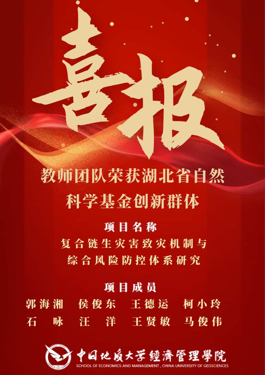 近日,湖北省自然科学基金获批名单公布,以我院郭海湘教授、侯俊东教授、王德运副教授、柯小玲副教授、石咏特任教授为核心的科研团队,协同工程学院汪洋教授、地球物理与空间信息学院王贤敏教授、湖北巴东地质灾害国家野外科学观测研究站马俊伟副研究员,共同申请的“复合链生灾害致灾机制与综合风险防控体系研究”,荣获湖北省自然科学基金创新群体项目支持,该群体项目是学校培育支持的复合链生灾害风险决策与应急管理交叉团队的重要成果,也是近年来学院获得的首个交叉学科湖北省自然科学基金创新群体项目。
