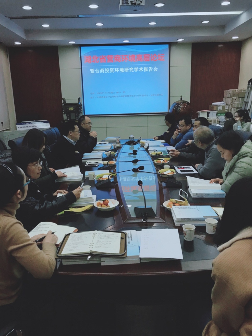 (通讯员吴磊、谢伟伟)2018年1月17日,“湖北省营商环境高层论坛暨台商投资环境研究学术报告会”在WilliamHILL中国区域经济与投资环境研究中心学术报告厅举行。湖北省台办王光斌处长、朱琨科长,经管学院杨树旺副院长、区域经济与投资环境研究中心邓宏兵教授,以及相关研究领域的专家、师生代表共计30余人参加了会议。邓宏兵教授主持了会议。