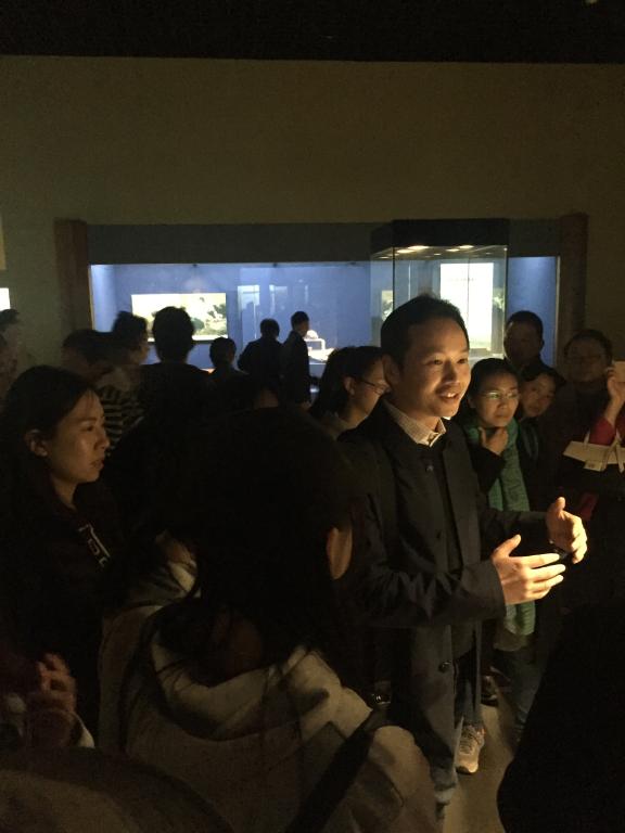 活动中,旅游系教师因时穿插讲解博物馆建筑、荆楚文化与中原文化的区别及其在馆藏文物中的体现。郧县人头盖骨化石展柜前,师生一起听取直立人考古发掘的历史,漫说人类起源与发展的迷思,领略荆楚大地上先人筚路蓝缕、以启山林的征程。越王勾践剑和曾侯乙编钟展柜前,春秋战国风云已散,青铜铸造技艺的科学解说却揭开了千年不腐的王者之剑寒光依旧在、锋芒仍逼人的奥秘,以及重见天日的祭祀宴乐礼器依然可以奏响新时代华美交响乐章的制作之迷,凸显出荆楚大地上春秋霸业、礼制秩序背后的科学与工艺基础。元瓷四爱图梅瓶展柜前,同学们又在欣赏铅华洗净、静逸清雅的青花时,随着解说一起了解了锻造其似柔实韧风骨背后的浴火新生历程。参观中,师生一起品味青铜和瓷器文明的博大精深,观察博物馆内的展品陈列和布展规划,体验广博的专业知识和娴熟的解说技巧带给听者的解说体验。(图4,图5,图6)
