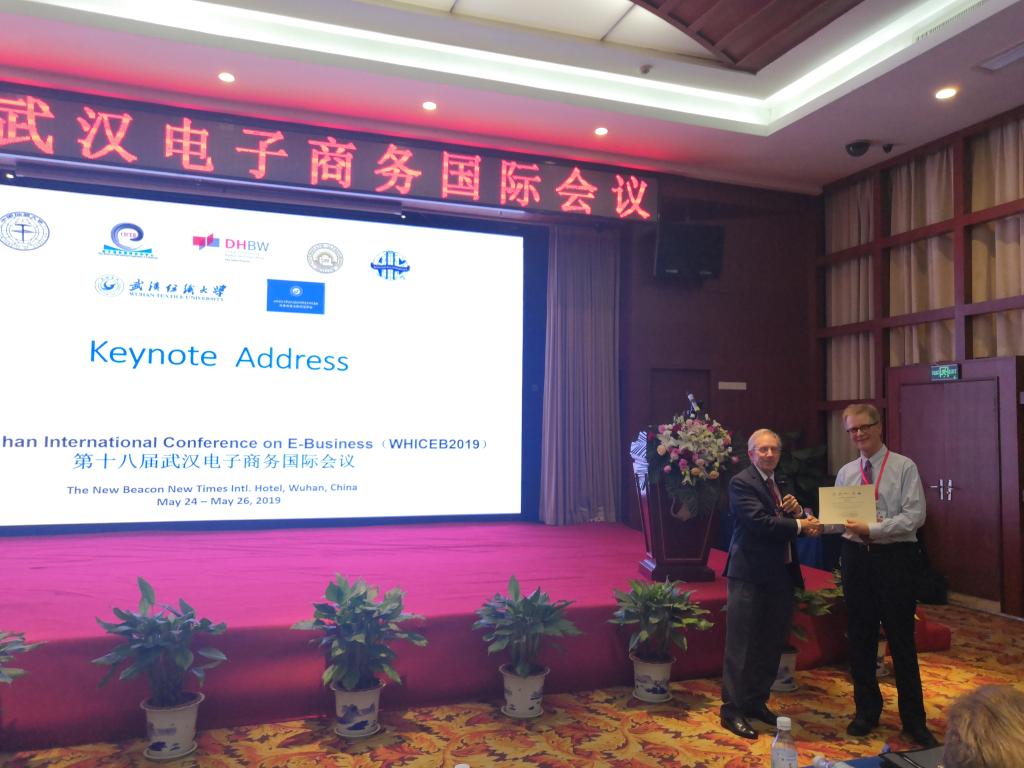 (通讯员:朱镇)2019年5月24日至5月26日,由我校williamhill英国中文、电子商务国际合作中心,美国阿尔弗雷德大学商学院和德国巴登-符腾堡州联合大学共同主办,武汉纺织大学管理学院参与承办的第十八届武汉电子商务国际会议在纽宾凯新时代国际酒店召开。会议主席赵晶教授主持了开幕式,校党委副书记成金华教授,国际信息系统协会前主席Doug Vogel(前AIS主席),以及信息系统学会中国分会副主席、中国人民大学王刊良教授现场致欢迎词。来自国内外高校的190多名专家学者参加了会议,其中来自美国、澳大利亚、德国、加拿大和芬兰等8个国家和地区,15所大学的21位国外专家出席会议。