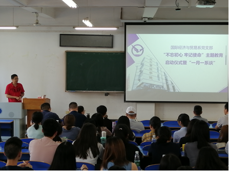 本次活动秉承国际经济与贸易系“师生共建”传统,共包括四项内容。首先,系党支部书记易杏花宣布国际经济与贸易系“不忘初心,牢记使命”主题教育活动正式启动,介绍了本系主题教育的主线——形式多样抓教育,学原著,读原文,围绕“一个根本任务”,落实“四个总要求”,切实领悟主题教育的四个重大意义,最终实现“五大目标”。在此基础上,易老师从理论学习找差距、服务师生抓落实、开好专题组织生活会受洗礼等三个方面的17项工作进行了安排。