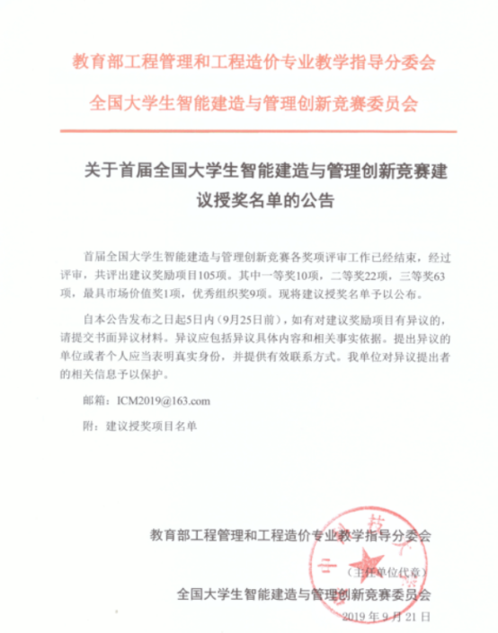智慧建造是工程管理专业发展的方向,工程管理信息化是行业发展趋势。我校工程管理专业近年来紧跟专业和行业的最新动态,积极开展智慧建造和工程管理信息化的教学和科研工作,取得了很多成果,本次大赛取得的成绩也是对工程管理专业近年来在此方向上努力的回报。工程管理专业将以此次大赛为契机,更加积极地推进我校工程管理专业在智慧建造和工程管理信息化方向的教学和科研工作,争取更好的成绩!