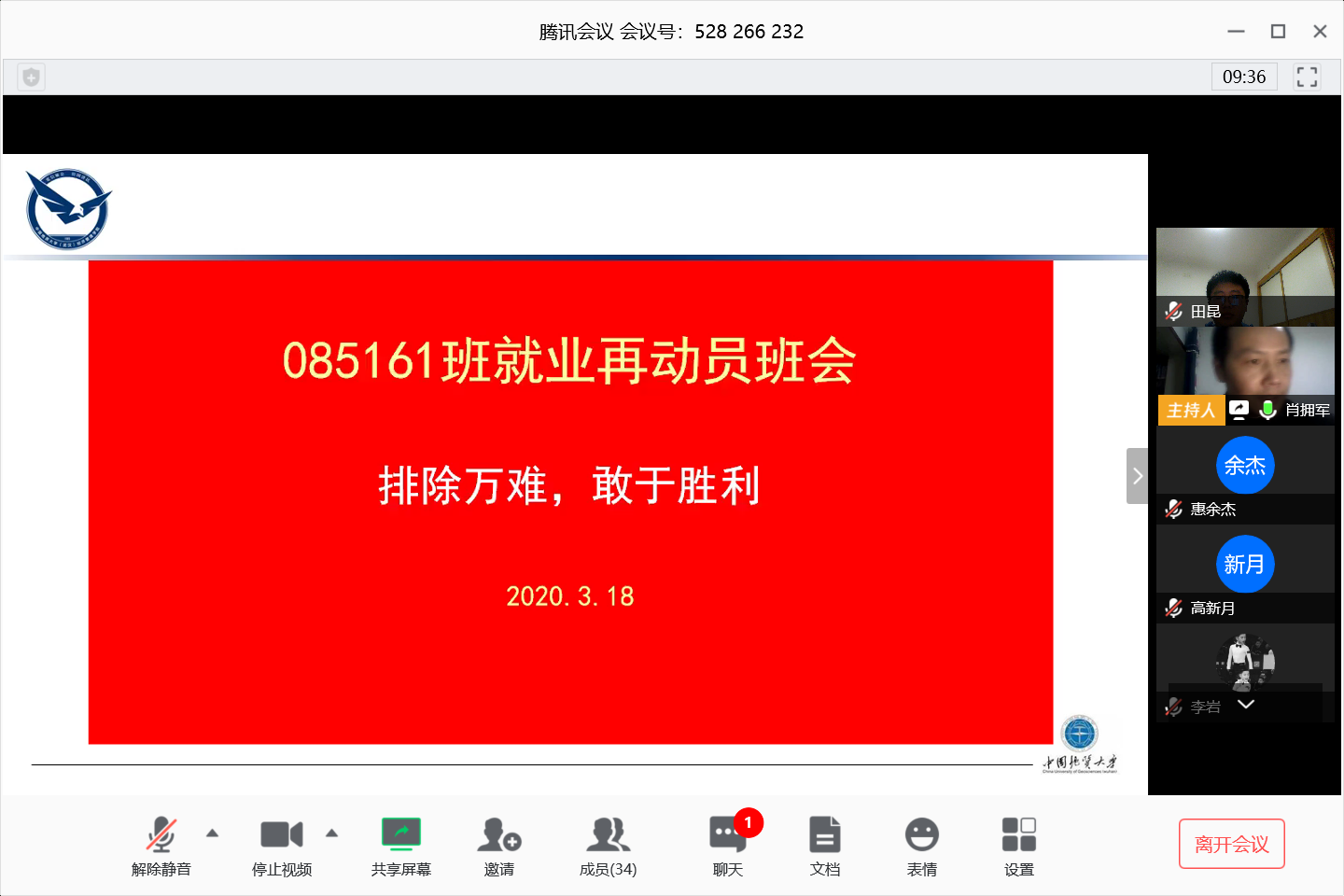 3月18日晚19:30,williamhill英国中文旅游管理专业085161班“排除万难,敢于胜利”就业再动员主题班会顺利举行。受到疫情影响,本次会议通过腾讯会议平台以线上形式开展,班主任、旅游系系主任肖拥军,学院16级辅导员田昆及旅游管理专业085161班全体毕业生共36人参加会议。