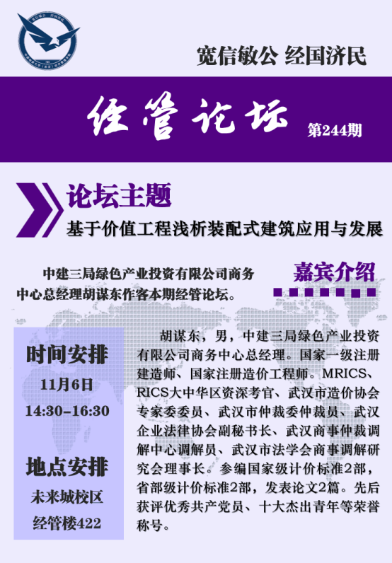 2020年11月6日下午,中建三局绿色产业投资有限公司商务中心胡谋东总经理做客经管论坛,在未来城校区williamhill英国中文422作了《基于价值工程浅析装配式建筑应用与发展》的报告。王广民、孙涵、翁克瑞、柯小玲、何晨琛、卢辉、彭亚婷等老师及多位博、硕士研究生到场聆听胡谋东总经理的精彩报告。