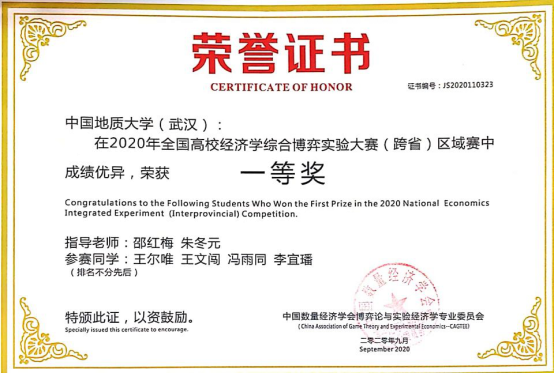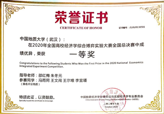 (通讯员:邵红梅)近日,2020年(第三届)全国经济学综合博弈大赛落下帷幕,学院邵红梅老师和朱冬元老师指导的学生王文闯和王尔唯(均为经济学专业081181班本科生)荣获一等奖。