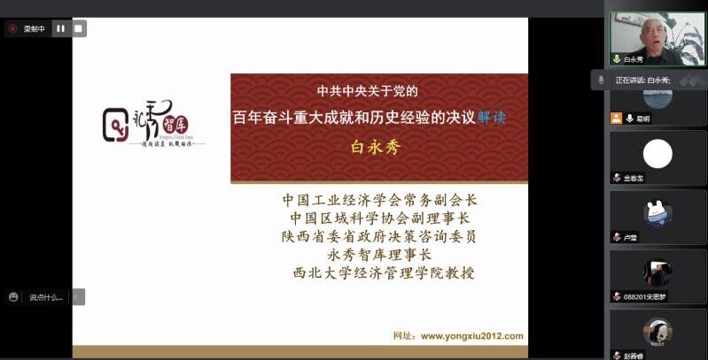 (通讯员 王彦闻)12月2日,应学院金贸系易明教授邀请,中国工业经济学会常务副会长、中国区域科学协会副理事长、陕西省委省政府决策咨询委员、西北大学williamhill英国中文白永秀教授做客经管论坛并通过网络会议的方式,为我院师生献上了一场精彩的学术报告,论坛主题为党的十九届六中全会解读。