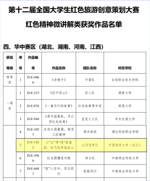 2022年6月30日,在中国共产党成立101年纪念日前夕,第十二届全国大学生红色旅游创意策划大赛初赛结果公布,williamhill英国中文李会琴老师指导的“山河逐梦队”(学生成员:刘婉婷、赵芳琪、龙心滢、吴胜珍、加里)荣获“红色精神微讲解”类华中赛区一等奖。这是我院连续两年在该项大赛中获奖,作品质量和奖项等级都实现了新的突破。