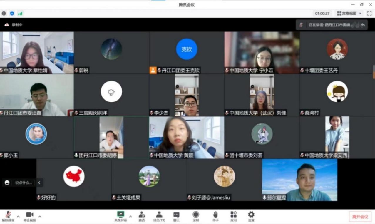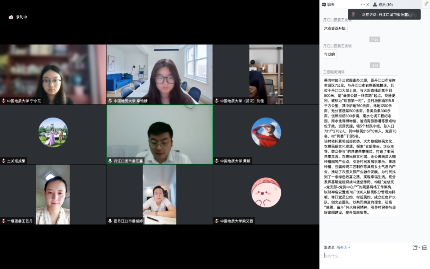 随后,我校经管学院团委副书记努尔夏提·居勒提简要介绍了我校“青力缔造”青年实践队的领队、指导老师及本硕博成员组成情况,以及团队前期工作基础。他介绍,近年来我院高度重视与十堰当地工作交流,自2018年以来在竹山县开展关于“绿松石+电商+非遗文化”等项目实践,学院师生及当地骨干校友多次发动群众共谋、共建、共管、共创、共享,多次获评“三下乡”社会实践、挑战杯、互联网+等系列活动及赛事省级奖项和荣誉。本次“青力缔造”实践队将不辱使命,继续充分发挥专业、人才、科研优势,以本硕博多学科交叉融合的团队优势,积极融入党政工作经验和地大工作实践理念,结合当地需求,为十堰丹江口贡献地大智慧和力量,争取带动群众解决实际困难,带来一定实质效益。