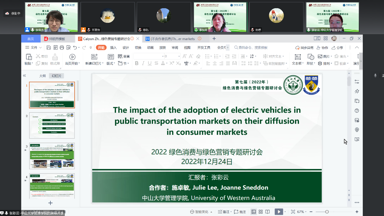 12月24日上午,以“绿色消费与绿色营销”为主题的报告中,各位专家带来了丰富的学术盛宴。江苏大学管理学院杜建国教授做了题为《供需协同视角下绿色消费行为促进机制》的分享,为大家打开了绿色消费行为研究的新视角。对外经济贸易大学国际商学院孙瑾教授做了题为《营销视角下可持续性消费相关研究“碳”索》的报告,从营销视角下分析可持续消费的背景、进展和未来发展方向。华中科技大学管理学院常亚平教授做了题为《谈谈“双碳”的商业机会》的报告,从营销视角分享实现“双碳”目标的商业机会和研究可能。日本关西大学商学院李振教授和做了题为《A review of social roles in green consumer behavior》的报告,分享了社会角色在消费者绿色消费行为的作用的文献综述。
