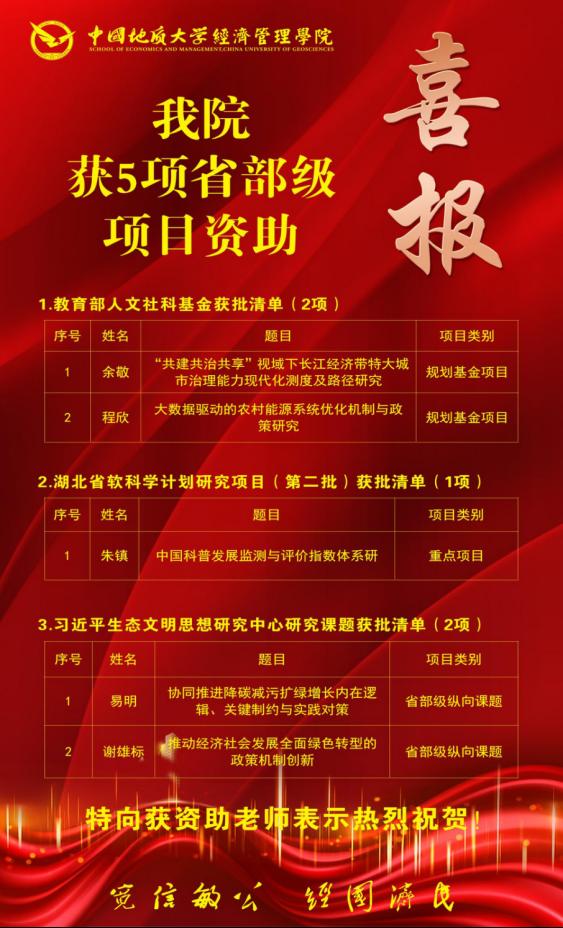 (通讯员 胡松琴)近日,随着2023年度教育部人文社会科学研究一般项目评审结果的公示、2023年湖北省软科学计划研究项目(第二批)拟立项项目向社会公示、习近平生态文明思想研究中心2023年度研究课题的公示推出,williamhill英国中文获批省部级项目共5项。其中教育部人文社科2项,省软科学计划研究项目(第二批)重点项目1项,习近平生态文明思想研究中心研究课题2项。具体名单如下: