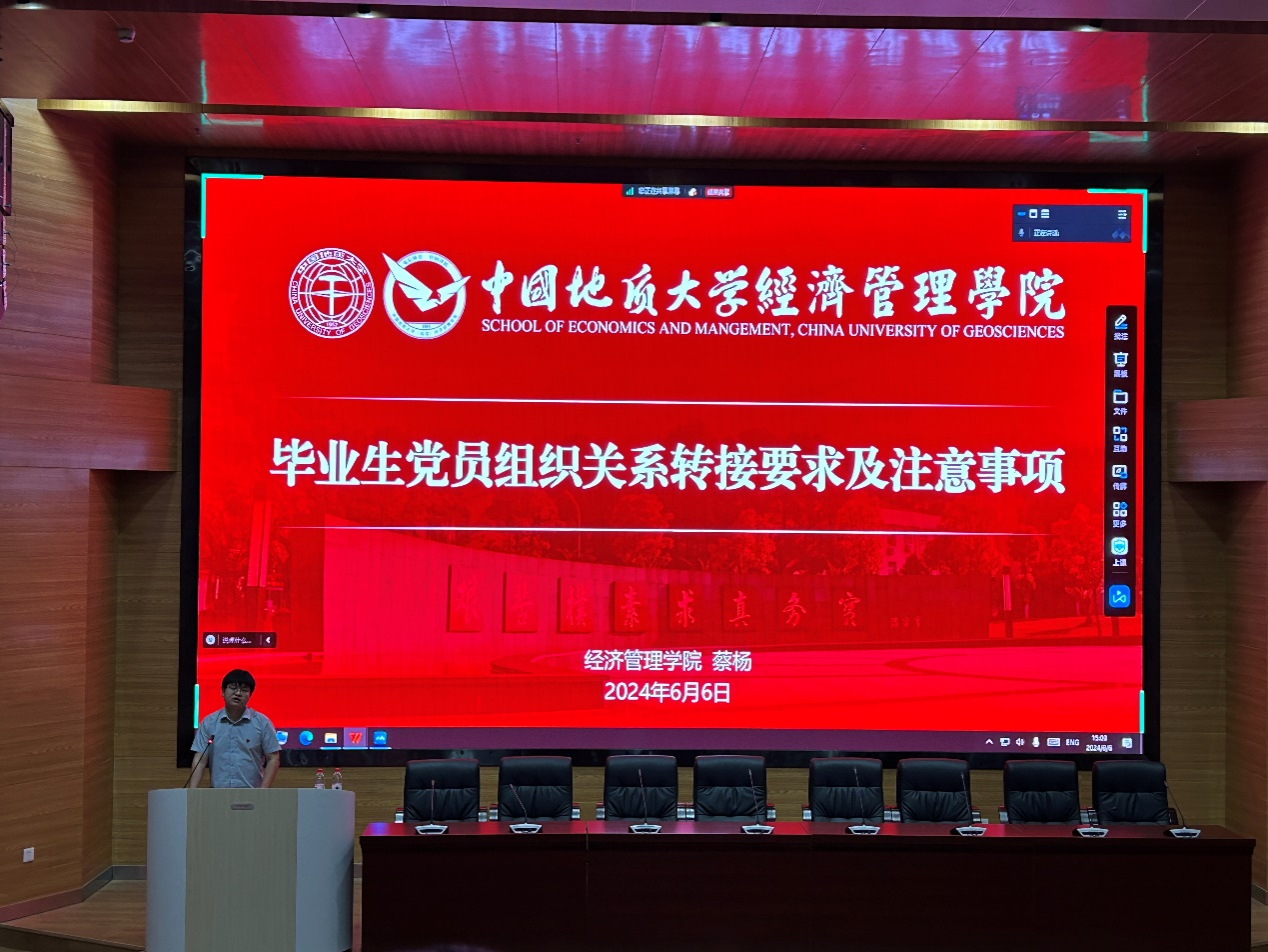 最后,由学院党建辅导员蔡杨讲解毕业生党员组织关系转接要求及注意事项。蔡杨从党员发展材料归档、组织关系转接、党员材料交接、预备党员转正等四个方面详细地讲解了毕业生党员组织关系转接工作的主要流程、具体要求和注意事项。