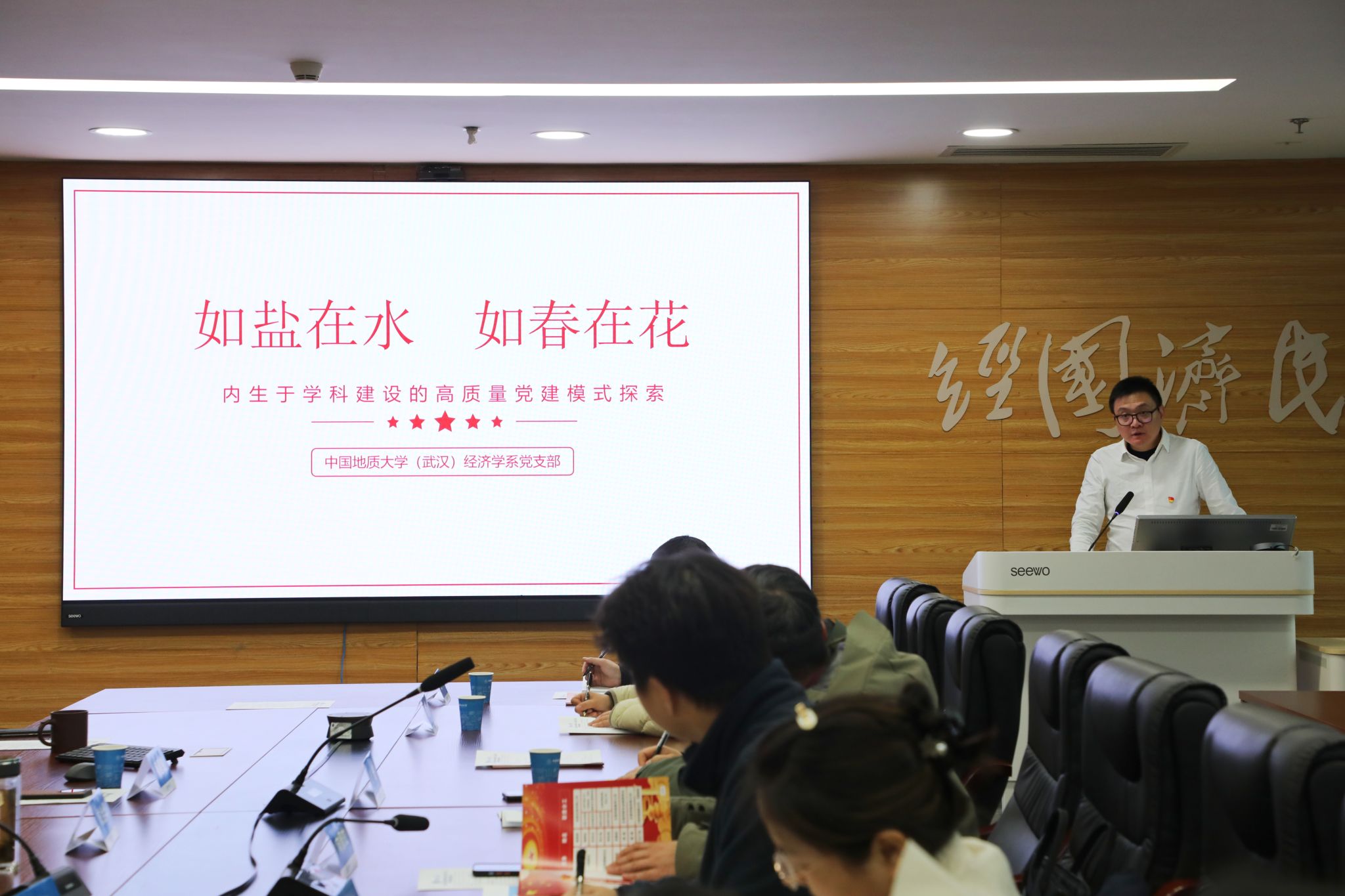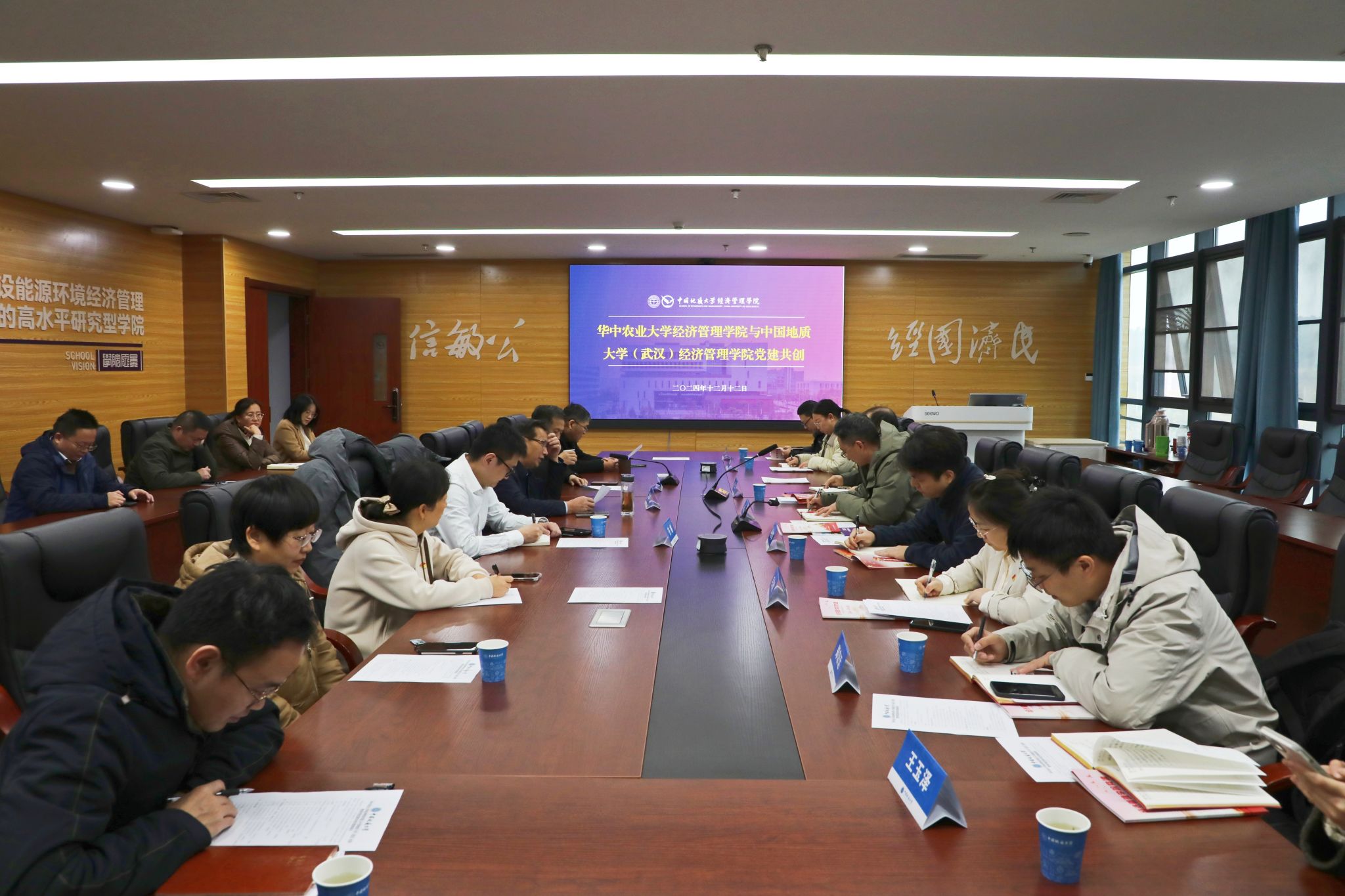 会议伊始,成金华致欢迎词,对华农经管学院老师的到来表示热烈欢迎,并期待通过此次交流能够增进两院之间的友谊与合作。向晋文书记在随后的发言中表示,此次来访是慕名而来,两院党委皆为第四批标杆院系入选单位,地大经济系党支部和华农农业经济管理系党支部均为第二批全国样板支部,两个学院党建工作相似之处恰好可以彼此取经互鉴,希望通过“结对共创”活动,共同推动党建工作的创新发展。