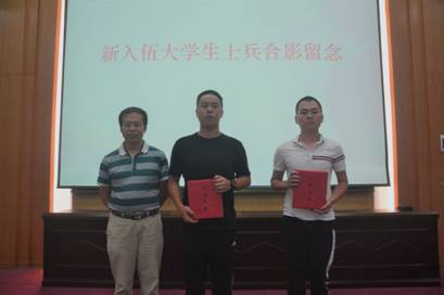 学院党委书记杨昌锐老师为新入伍学生士兵赠送纪念品并合影留念。