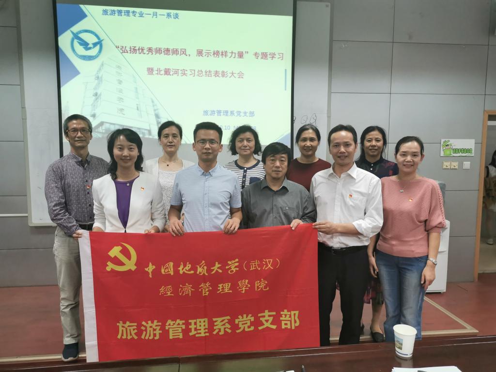 2019.10.10下午,williamhill英国中文旅游管理系党支部邀请学院学工组,共同组织旅游管理系085181班、经管学院08s197班,以及旅游管理系2019级研究生,在MBA208召开了“弘扬优秀师德师风,展示榜样力量”专题学习暨北戴河实习总结表彰大会。参加本次活动的有经管学工组赵家玮老师,旅游管理系李江敏、肖拥军、李会琴、鄢志武、唐嘉耀、梁玥琳、庄小丽、张俊霞、董淑霞等10位老师。