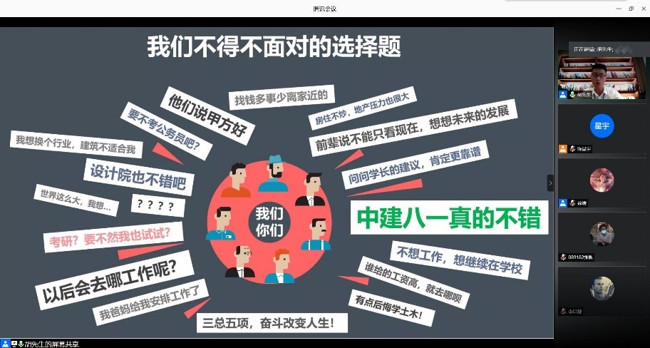 由工程管理专业本科生党支部主办组织的中建八局一公司宣讲会于2020年6月18日下午14:30在腾讯会议准时召开。宣讲会由徐媛老师主持,中建八局一公司人力资源部招聘经理胡丙臣进行宣讲,工程管理专业30余位学生参会。