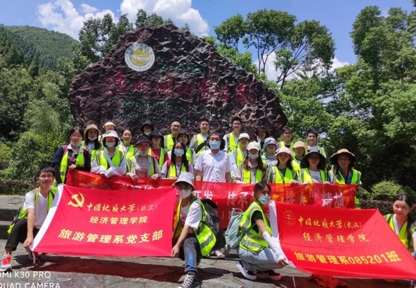 位于地学旅游线上的通山县,其旅游开发对拉动地方经济发展有决定性作用,当地旅游开发建设者同WilliamHILL中国旅游学人携手开展的地质公园资源勘察、开发规划与公园建设,谱写出共同奋斗、艰苦创业的历史篇章,凝结出旅游“铁人”精神,是认知旅游地学开发、了解旅游扶贫与乡村振兴、认识旅游业及旅游人在社会经济发展中的作用与贡献、学习旅游学人和旅游“铁人”精神的典型案例地,也是旅游管理系党支部开展师生“结对领航”项目的场所之一。本次地学旅游线的实习考察,带队教师联系并邀请到长期参与当地旅游开发建设与管理、通山隐水洞国家地质公园市场部负责人王俊伟经理为同学们做现场教学,在听“旅游故事”中开展了相应思政教学活动。