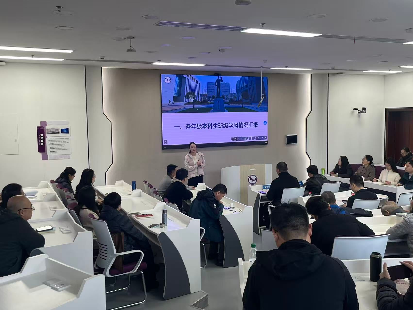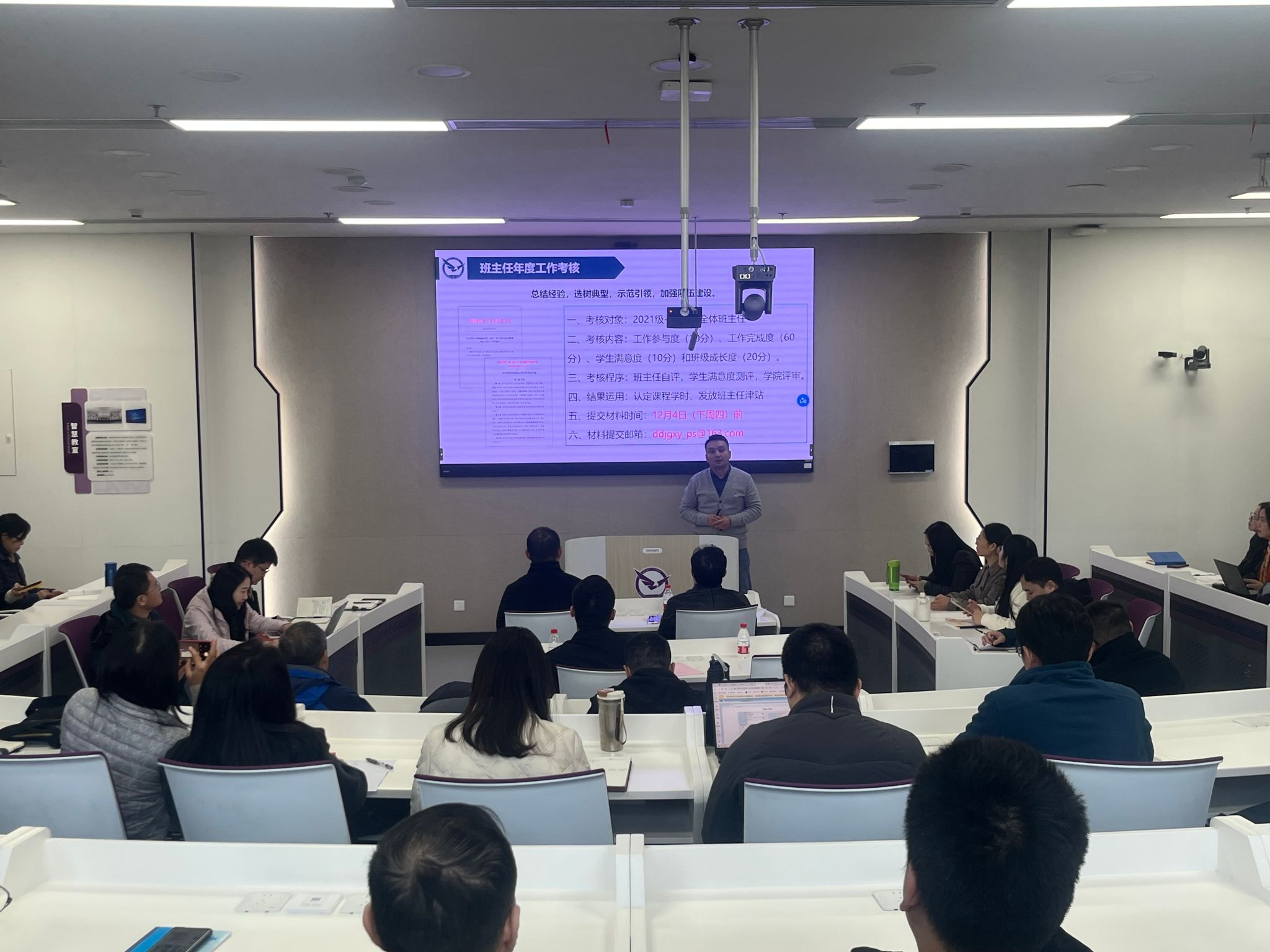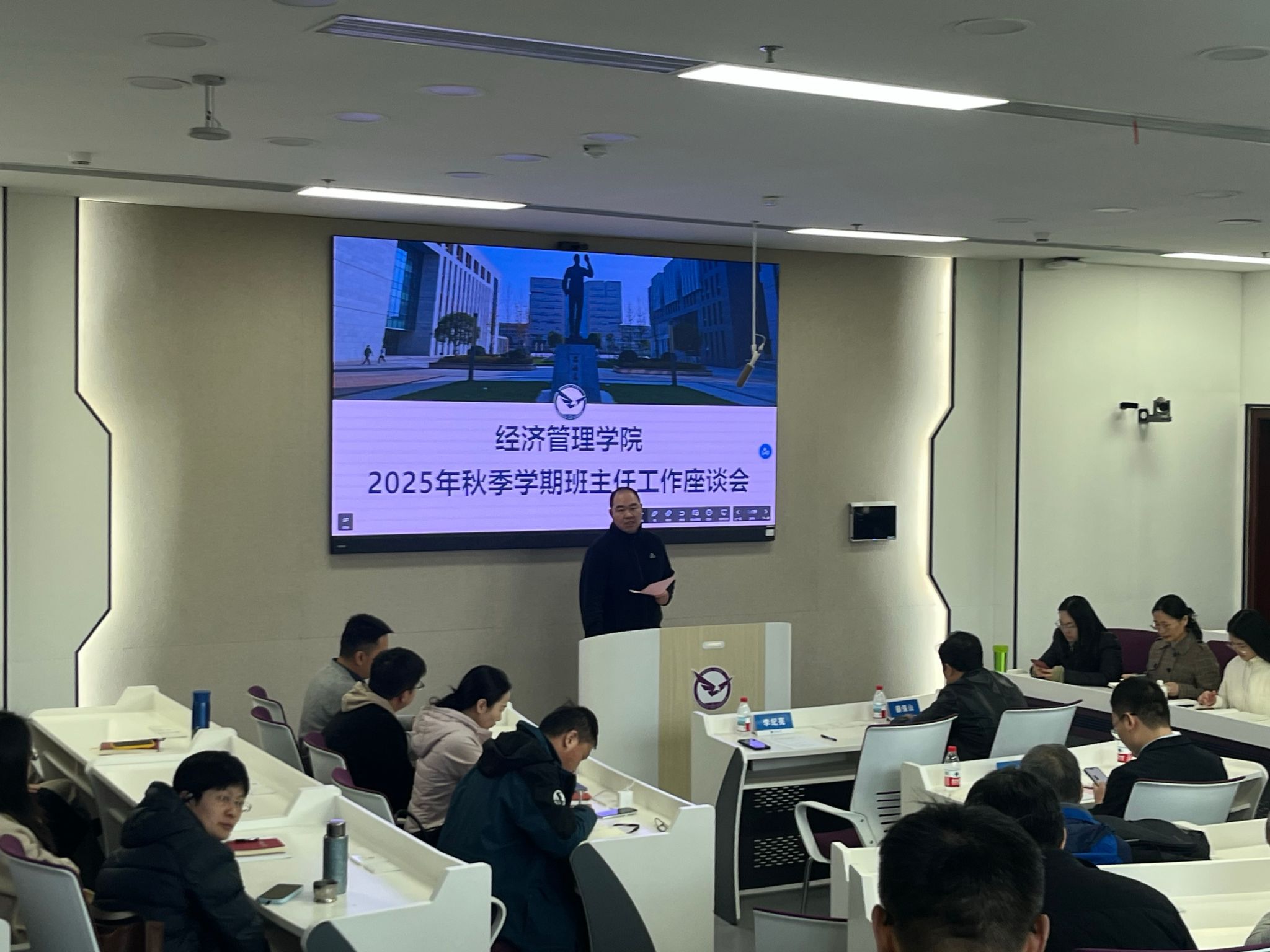 会上,学院辅导员分别就本科生各班级学风、就业情况,班主任年度考核和评优工作等进行了汇报介绍。分团委书记、2023级辅导员徐媛结合近期课堂考勤监督强化、请假流程进一步规范、晚自习日常管理和学业帮扶计划等方面介绍了学院“红鹰促学”计划开展情况和阶段性成果。她从学生课程成绩的具体数据客观分析了当前学风建设中的亮点与存在的不足,提醒班主任们关注班级学风动态。2022级辅导员蔡杨就毕业生班级就业工作展开汇报。他结合具体数据分析了近年来毕业生就业去向,学生考公、考研意向的变化新形势,针对2025届毕业生和2026届毕业年级的学生就业意向,就业行业分布特点,以及学院就业帮扶成效和面临的工作挑战作了详细介绍,并围绕下一步就业指导工作为班主任开展就业帮扶提供了一定的方向参考。学工办主任努尔夏提・居勒提介绍了年度班主任工作考核及评优工作,并就相关要求进行解读。他从考核原则、评优指标、标准流程、激励机制等方面逐一说明,动员班主任们积极参加考核和评优,以评促优充分展现班级风貌和培养学生的成效。