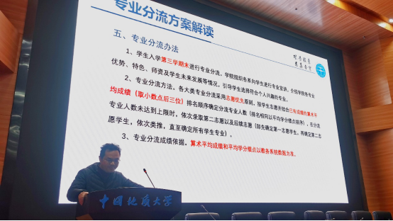 会议开始,教务科石磊老师对学校、学院的专业分流实施方案进行了解读。本科生按大类招生的政策体现了以学生的全面发展为最终目标,以培养宽口径、厚基础、高素质、强能力,具有创新精神的复合型高级经济和管理人才为具体目标的宗旨。按照“打通”培养和“分段”培养相结合的方式,学生进校后前1.5年,以通识教育课和大类基础课学习为主,学院针对“三个大类”和“一个专业”开设统一的大类基础课(学科平台课程),以为学生更好地学习专业课程和未来的发展奠定宽广而坚实的基础。我院工商管理大类按照分流要求,计划分为工商管理(双语班)、市场营销、会计学和旅游管理四个细分专业,大类专业分流采用公开、公平、公正的以志愿与专业规模适度平衡相结合、学生志愿与学习成绩相结合的原则,按学生志愿并结合已有成绩的算术平均成绩排名顺序确定分流专业人数,在分流专业人数未达到上限时,依次录取第二志愿以及后续志愿。
