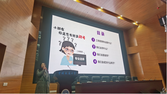 随后,工商大类各系代表教师进行专业分流宣讲。市场营销系郭锐老师就市场营销专业进行了正确解读,他指出营销不等于推销,营销是企业工作的核心;他还对营销系课程安排、师资队伍以及就业前景进行了简单的介绍。张京老师针对我院工商管理专业双语教学的办学特色着重进行了介绍,分享了往届工商管理双语班毕业生的就业和升学去向,并将往届优秀毕业生精心准备的介绍和祝福视频带到了宣讲会。会计系杨洁老师分析了会计学科的发展方向,指出财务人员在未来不仅不会被淘汰,反而需求巨大,此外她还对学生未来深造方向、就业去向进行了解读。旅游管理系肖拥军老师从旅游业发展视角出发,向同学们介绍了专业培养项目、专业发展前景,解决了学生在就业方向上的疑惑。各系宣讲后,在互动交流环节中同学们积极向老师提出专业发展、升学、就业等方面问题,老师们为其答疑解惑、指点迷津。