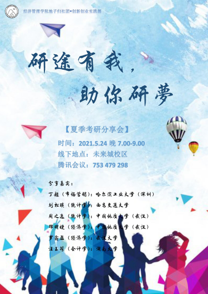 近年来,考研升学成为越来越多大学生的毕业选择。然而,很多计划考研的同学对考研政策和前期准备有些生疏。为了提升经管学子考研上岸率,帮助其了解考研政策,掌握备考技巧,williamhill英国中文地子归社团联合学生会创新创业实践部,于2021年5月24日晚组织了“研途有我,祝你研梦”春季考研经验分享会。邀请市场营销专业丁超、会计学专业汪玉荷、经济学专业邓明婕、经济学专业罗鑫磊、统计学专业刘松琰等2021届成功上岸的同学给考研党们带来了精彩的干货分享。本次活动结合线上线下的方式进行,近100名同学积极参与并展开交流。