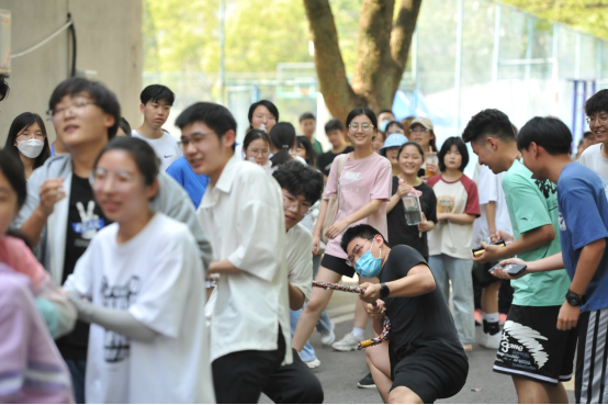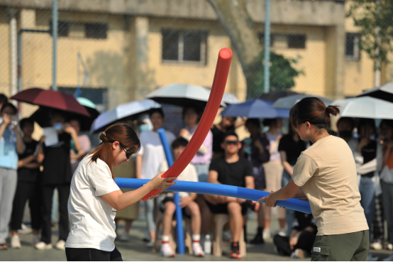 第四项:蒙眼互打。这个项目人气爆棚,活动现场瞬间成了武林高手过招现场,听声辩位,左突右刺,围观的同学们不时爆发出一阵阵笑声。