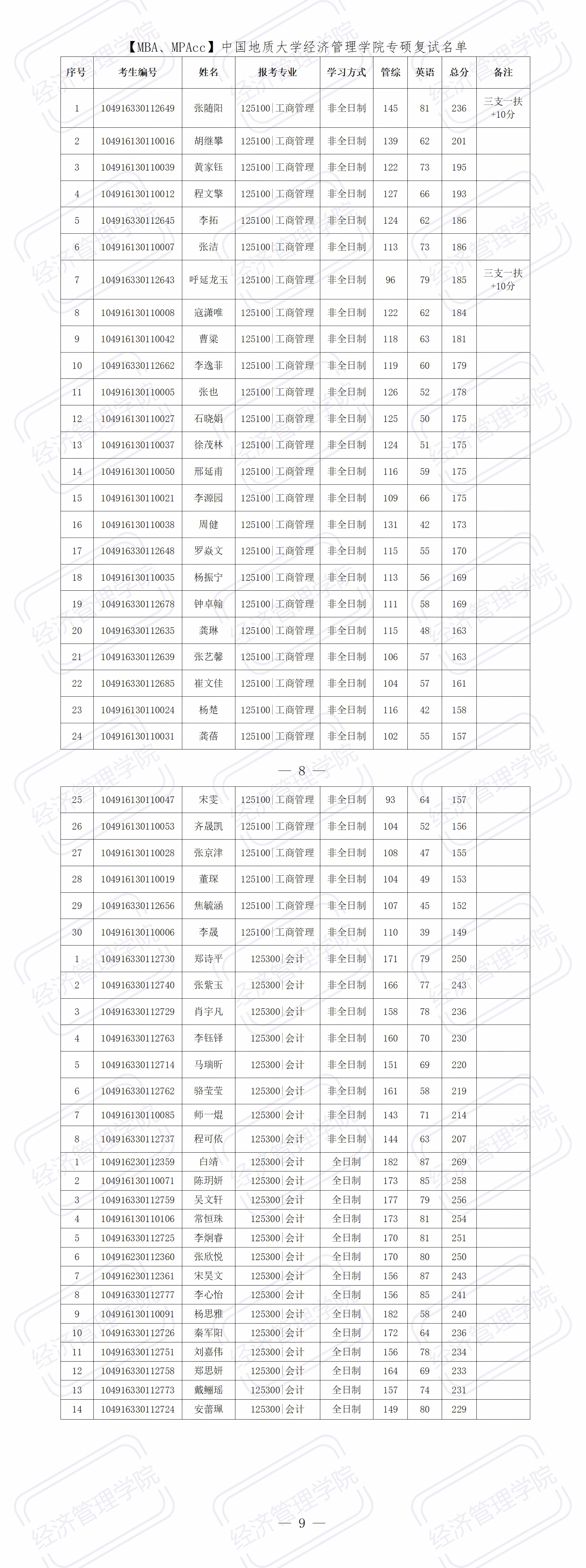 一、【MBA、MPAcc】中国地质大学williamhill英国中文专硕复试名单
