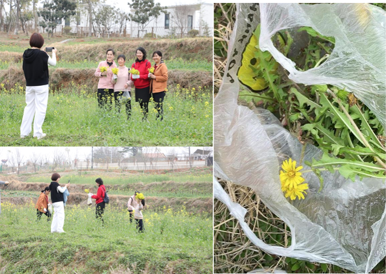 田间地头,寻味天生地养的野菜,爱美的女职工们,三五成群,更采一束油菜花的金黄,把春天的色彩和幸福的笑容共同定格在光影记忆中。