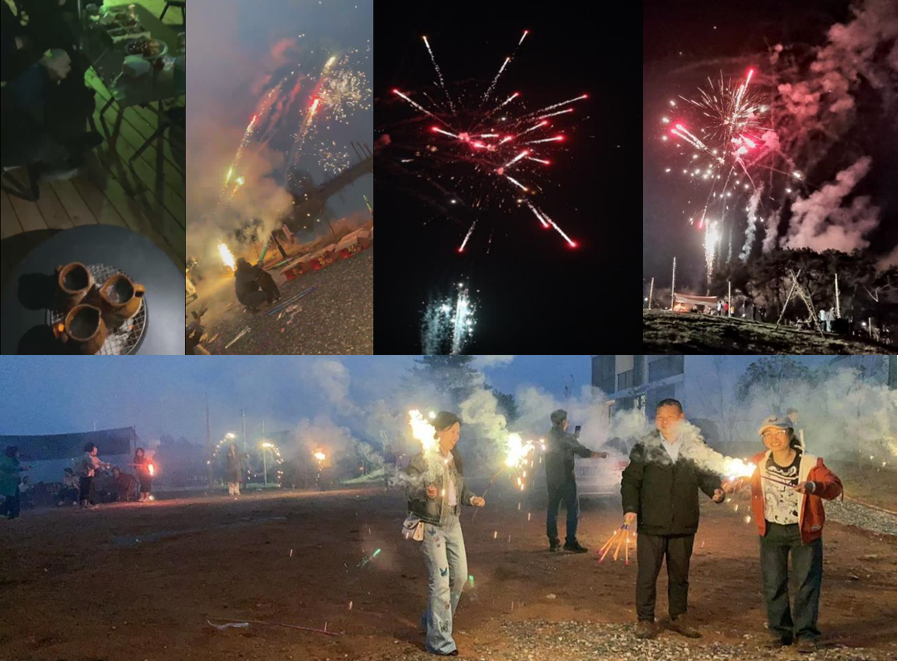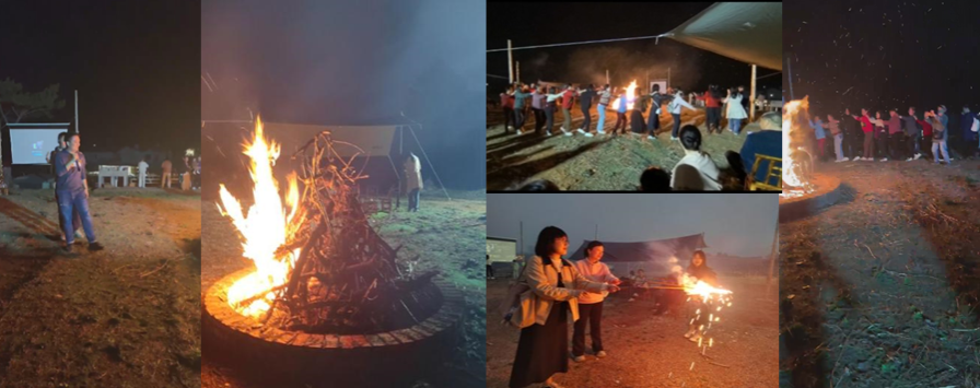 用过晚餐,暮色四合,天边最后一抹余晖隐去后,安排了烟花秀和篝火晚会。夜幕下,有的围炉而坐,一边品尝煮甘蔗水的鲜甜,一边欣赏烟花在空中烂灿绽放;爱热闹的,与家人和同事携伴,欢乐燃放各式烟花,在烟花的燃烧、喷发和绽放中回味童年的乐趣,体验此刻的温馨与美好。