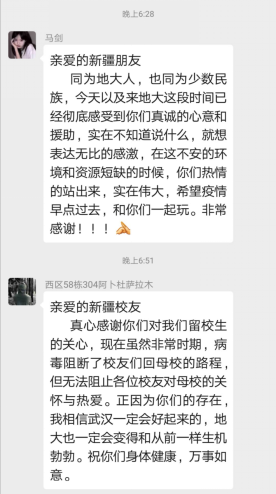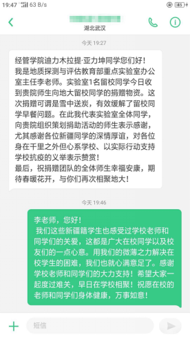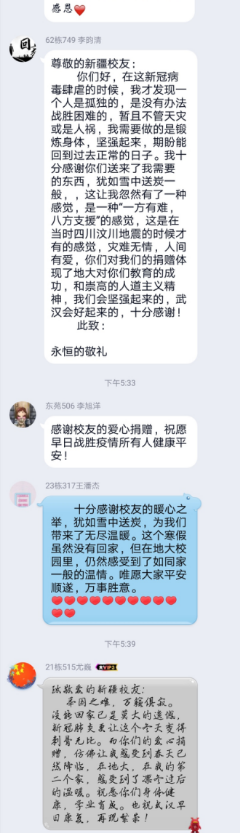 学校党委副书记王林清教授称赞道:“特殊时期,特别关爱,彰显同学情、爱校情,感谢同学们!”同时表达了问候。地大有真情,地大有温暖!在这个病毒肆虐的日子里,是地大“石榴籽”们用真情和爱心汇聚起了一缕阳光,团结一致为留在学校的同学们送去了温暖。收到援助物资后,老师和同学们用QQ、短信等方式纷纷点赞和表示感谢,也有的老师和同学以赋诗吟诵等方式表示致敬。
