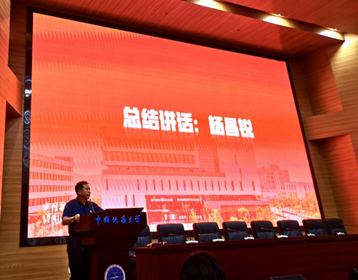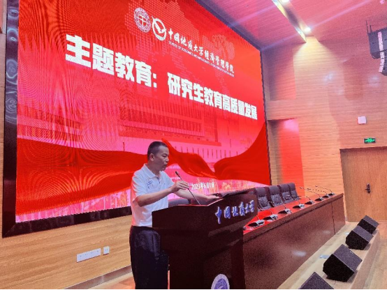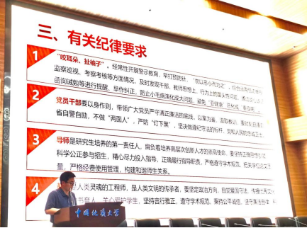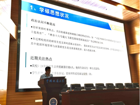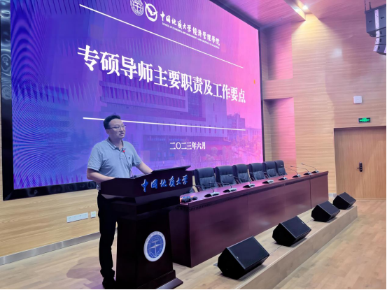 郭锐副院长对专硕教育现状进行了汇报,从师生交流、论文开题、撰写以及答辩等方面对导师指导情况进行了详细介绍,并领学了《中国地质大学专业学位研究生培养工作的规定》,从招生、教学、开题、学位等环节强调了导师工作的主要职责。